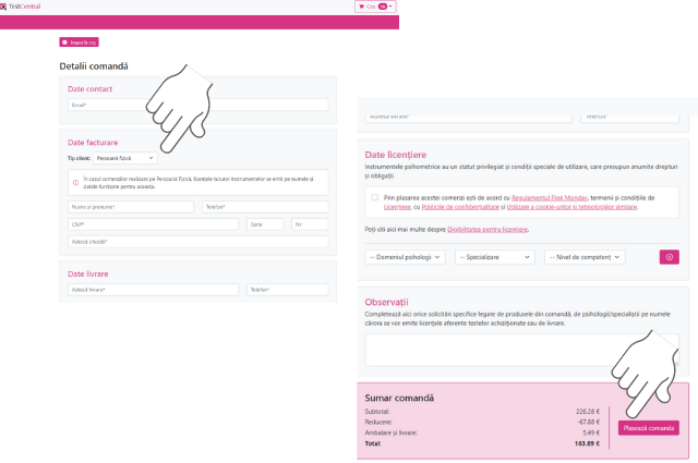Această acțiune conduce către pagina de completare a datelor de contact, facturare, livrare și de licențiere. Aici se poate seta dacă factura se emite pe persoană fizică sau juridică, se agreează termenii contractuali și se furnizează date cu privire la nivelul competențelor profesionale. Câmpul Observații permite consemnarea liberă a oricăror comentarii pe care clientul le consideră necesare. Atunci când datele sunt complete (anumite câmpuri sunt obligatorii) și corecte, se apasă butonul Plasează comanda din partea de jos a ecranului.