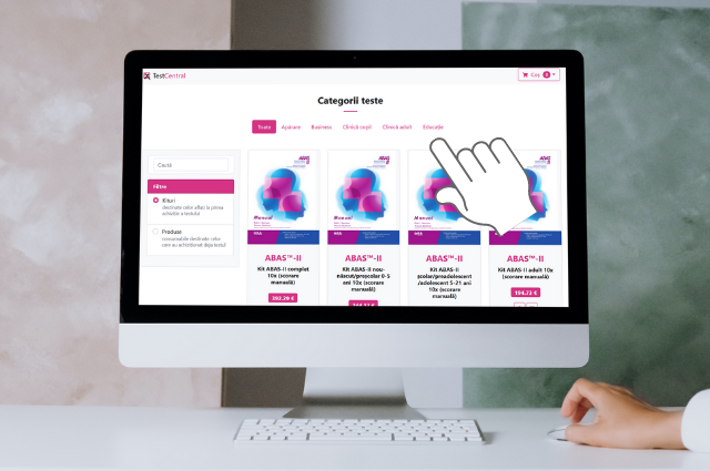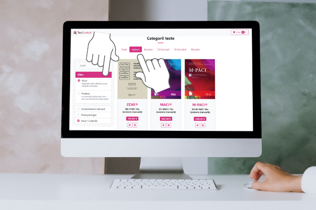 Pe pagina principală vei observa în partea superioară Categoriile de teste: Toate, Apărare, Business, Clinică copil, Clinică adult și Educație. La accesarea paginii opțiunea este preselectată automat pe Toate, astfel încât dacă derulezi până jos, poți vizualiza toate kiturile sau produsele care intră în promoție. Selecția unei categorii diferite va restrânge automat numărul de teste la cele incluse în categoria respectivă (selectezi categoria Educație, vei vizualiza doar testele cuprinse în această categorie).