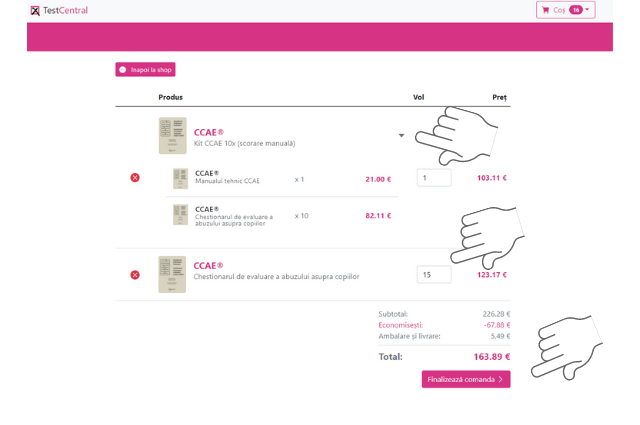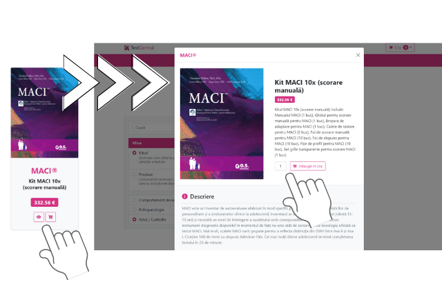 Pentru fiecare test sau produs al unui test vei observa în partea inferioară a copertei două simboluri grafice: cel din partea stângă, ilustrând un ochi, îți permite vizualizarea detaliilor despre testul sau produsul respectiv, în vreme ce al doilea, ilustrând un coș îți permite adăugarea directă a produsului în coș. La apăsarea simbolului grafic ilustrând un ochi se va deschide o mică fereastră de unde poți modifica cantitatea dorită pentru produsul respectiv. Tot de aici îl poți adăuga în coș.