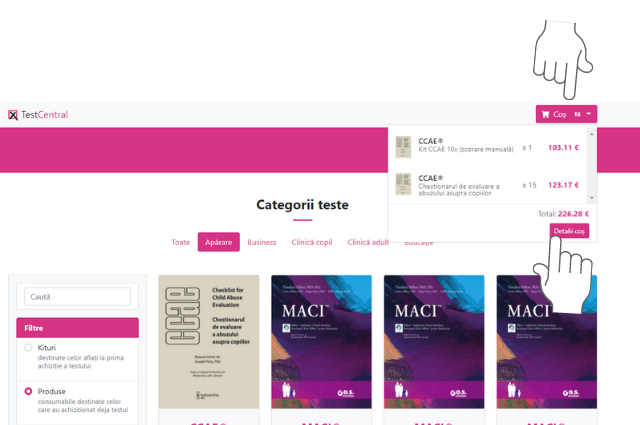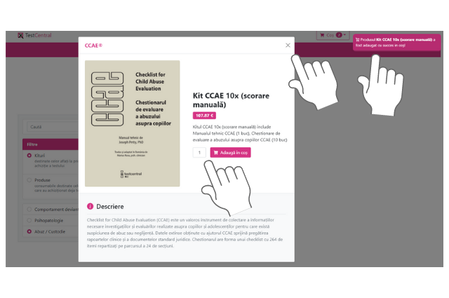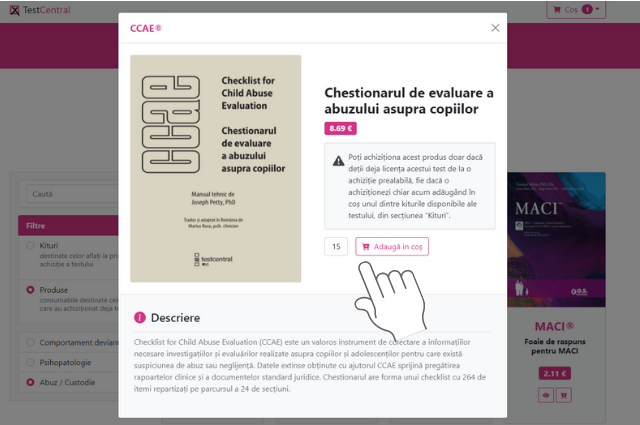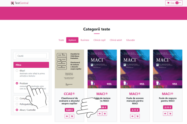 3. Iar apoi vei selecta din primul filtru, opțiunea Produse și vei adăuga numărul dorit de consumabile în căsuța din partea stângă (în acest caz să presupunem 15 bucăți din Chestionarul de evaluare a abuzului asupra copiilor CCAE) și vei apăsa butonul Adaugă în coș, fiind notificat de succesul operațiunii ca la pasul anterior, în colțul din dreapta sus al ecranului.